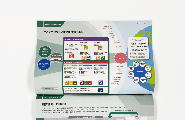 サステナビリティに関する、戦略、マネジメント、取り組み等ワンレポートで表現。外部評価を意識した情報の充実とレポートとしての読みやすさを両立。